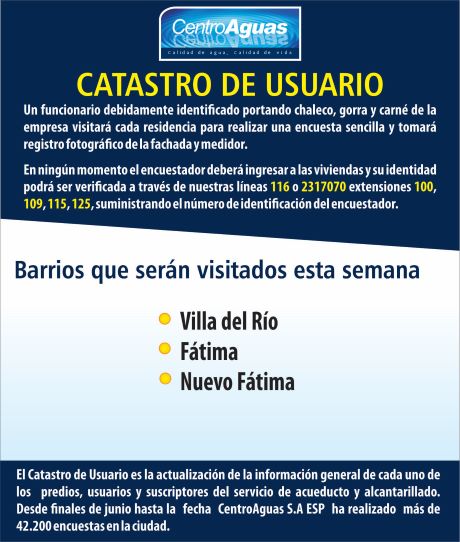 Barrios que serán visitados esta semana Escrito por Comunicaciones Centroaguas. Publicado en Noticias Frescas 07 de octubre de 2019 Anterior Siguiente
