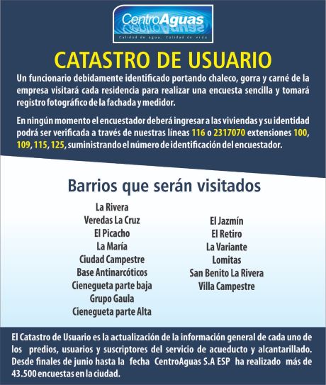 Barrios que serán visitados Escrito por Comunicaciones Centroaguas. Publicado en Noticias Frescas 10 de octubre de 2019 Anterior Siguiente