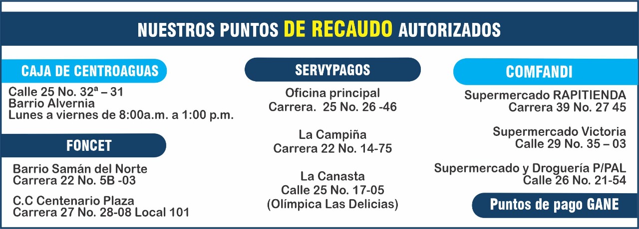 CENTROAGUAS S.A. ESP recuerda a la comunidad los puntos de recaudo autorizados para realizar el pago de las facturas de los servicios de acueducto y alcantarillado.
